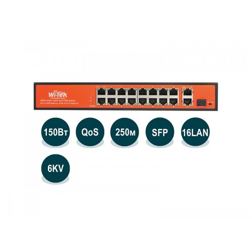 Коммутатор оснащен 16 портами 100Base-TX с поддержкой 802.3af/at (PoE, PoE+) 150 Вт, 2 портами 1000Base-T, 1 портом SFP